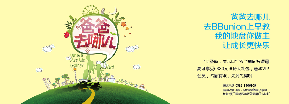 BBunion年终大回馈啦!为迎接双“旦”佳节,厦门外图BBunion国际早教特推出多重年终大礼包,让爸爸妈妈跟宝贝们在享受早教带来的欢乐的同时还把惊喜带回家!想把礼物捧回家吗?还在考虑什么,赶紧带宝宝来BBunion国际早教厦门外图店吧,报名越早惊喜越大哦!!现场还有幸运大奖等着你们呢,赶快报名吧!“圣诞、元旦,爸爸去哪儿?”“去BBunion上早教抢礼包咯!”
